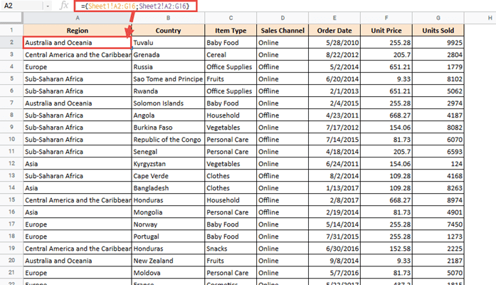 Now the first step is to create an array that combines both tables. Each table has entries ranging from cells A2:G16. So in a new sheet, add the column headers in the first row, and in the second row, enter the following formula: