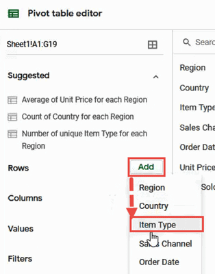 To display the list of Item Typesย in each row, click on the โAddโ button next to โRowsโ in your Pivot table editor. Select โItem Typeโ from the dropdown.