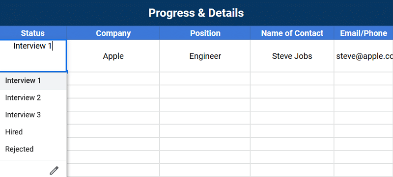 Column A (โStatusโ) allows you to mark whether youโre currently undergoing a second interview or have already been hired. In case you didnโt pass one of your interviews, you can also select Rejected from the drop-down list included. Columns B to E should display the interviewing company name and its contact details.