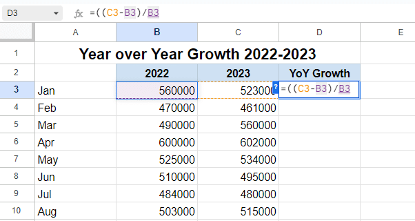 - In the cell for the YoY column, type the equals sign (=) and add 2 open brackets.