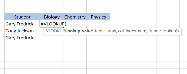 Suppose we wanted to look up more than one column of information. For example, in our example worksheet below, we can find the Marks for Melissa Danielle, specifically in Biology.