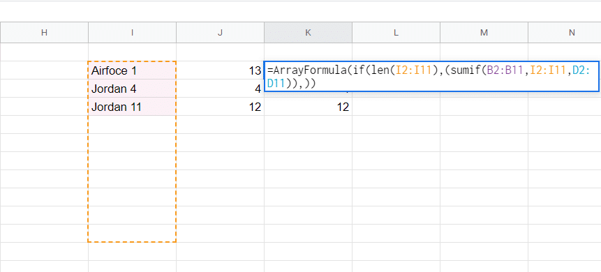 =ARRAYFORMULA(IF(LEN(I2:I11),(SUMIF(B2:B11,I2:I11,D2:D11)),))