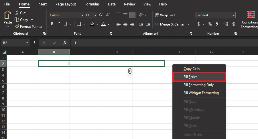 - Instead of filling them out manually, write the first value of the series in the initial cell.
