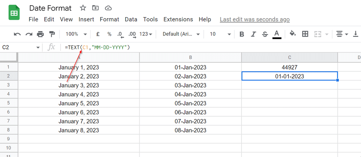 In the screenshot below, the formula =TEXT(C1,”MM-DD-YYYY”)was used to convert the DATEVALUE in cell C1 into text.