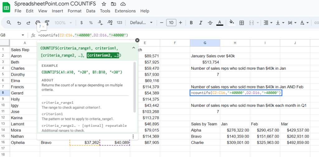 Here’s how it looks for the COUNTIFS function in Google Sheets.