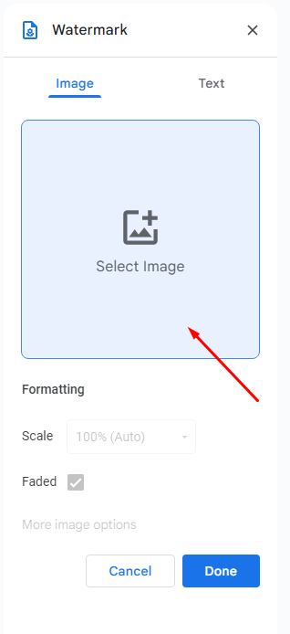 While you can directly use Google Docs’ “Watermark” tool to add an image watermark, you may want to upload it to Google Drawings first.
