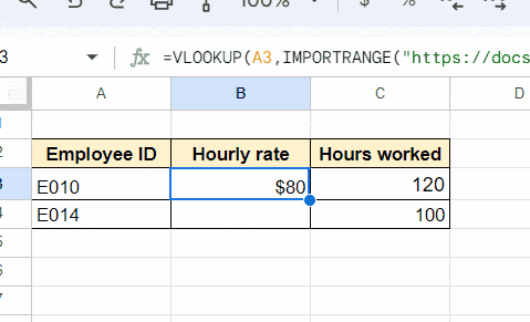 The mission: We want to access the Employees sheet and retrieve hourly rates of employee IDs โE010โ and โE014.โ Next, we want to display them in cells B3 and B4 of the Sales sheet.