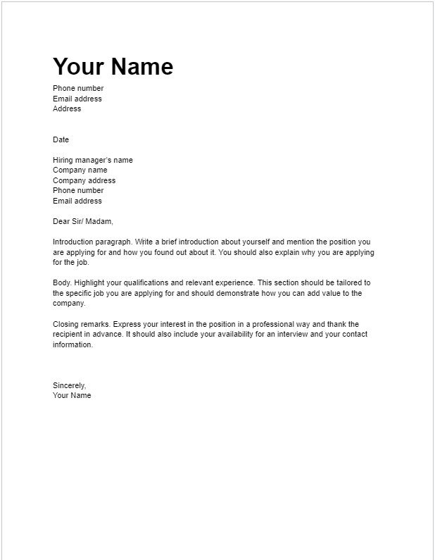 - Introduction– Write a brief introduction about yourself and mention the position you are applying for and how you found out about it. You should also explain why you are applying for the job.