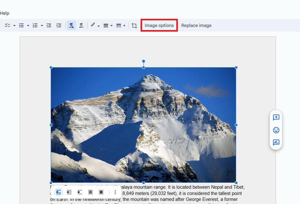 - With the image selected, click the Image options button in the toolbar. This will open the options in a sidebar.