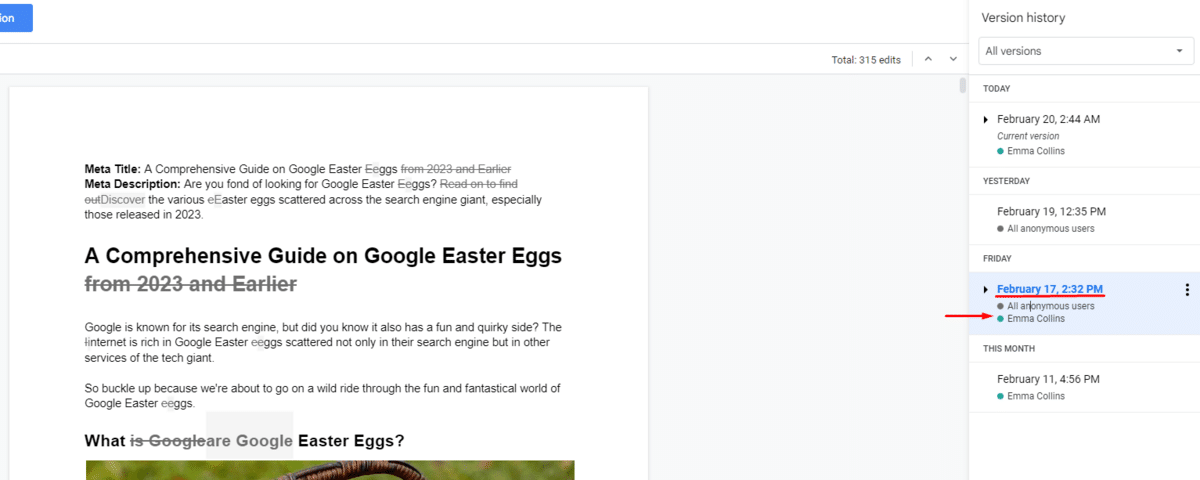 - Here, you will see the dates, time stamps, the current version of the document, and the names of the collaborators who edited the document.