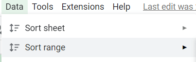 - Select sort range: In the dropdown menu that appears after clicking on Data, click on sort range or hover your cursor on it. This will reveal a sub-menu containing sorting options.