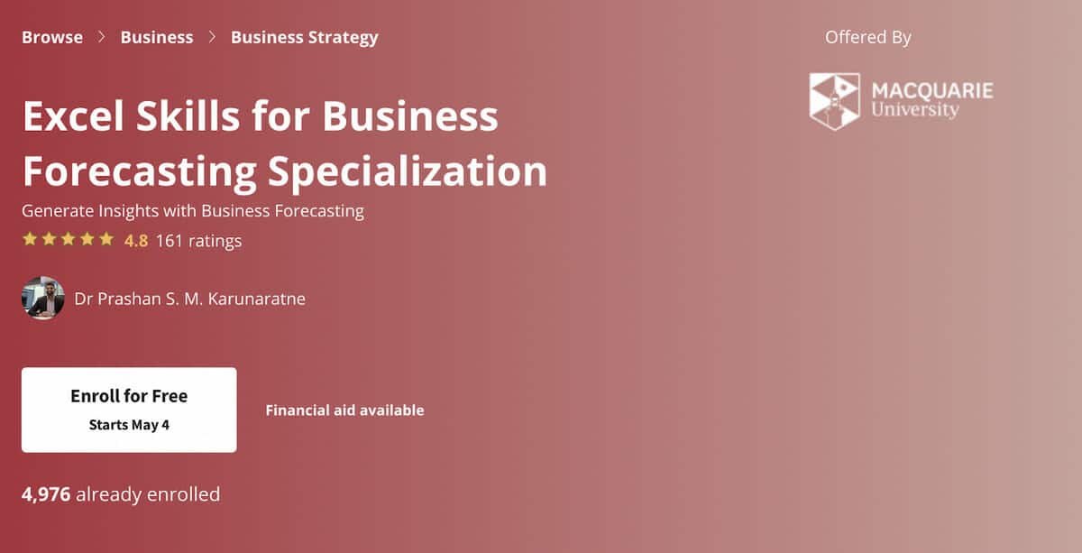This is another course from Macquarie University focusing primarily on using Excel to make business forecasts that rely on data. Since this is a Coursera specialization, youโll have the opportunity to enroll in multiple courses, including: