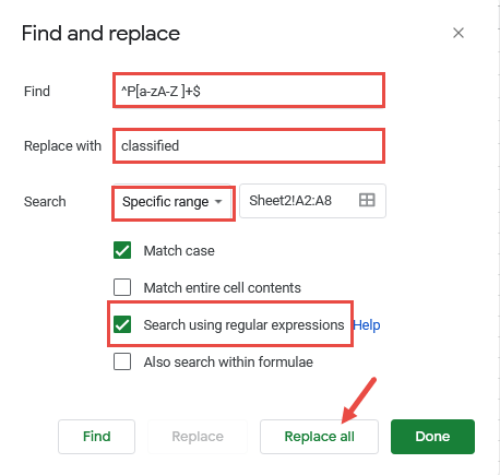 The Google Sheets Find and Replace dialog box is a highly valuable tool. It provides you a number of options, including the option to replace some or all occurrences of a search string, to look for strings that follow a pattern, and to also look inside formulae.