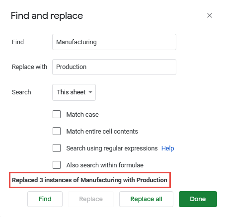 Using this function in our example sheet, we can replace the word Production with Manufacturing.