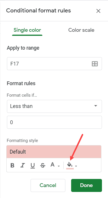 You can also just change the font of the cell value (which has a negative number) to red, instead of changing the entire cell color. This can be done by changing the font color only in step 7.