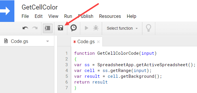 Once you have added this code to the Google Apps Script Editor, you will be able to use the function ‘GetCellColorCode’ to get the HEX code of the cell color in a separate cell.