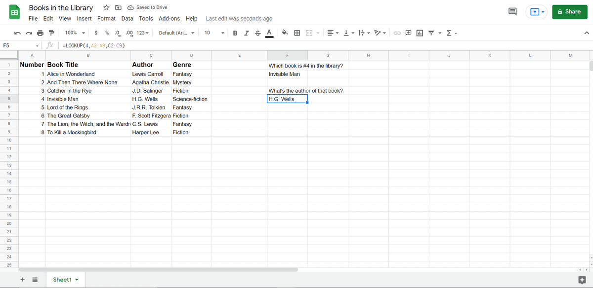 But even so, LOOKUP can make your job easier. In our example, we have only a few books to sort through. But in your example, you could have hundreds or even thousands of records to check.
