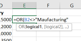 =AND(B2<>"Manufacturing",B2<>"Sales")