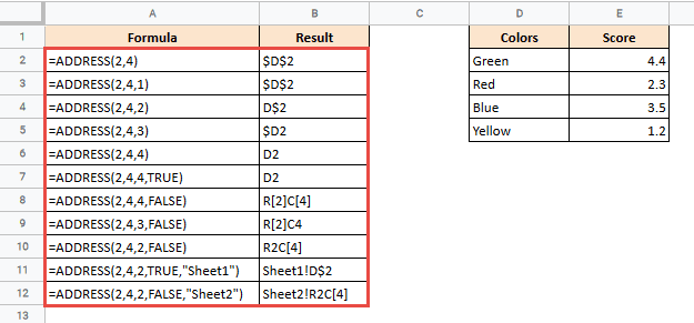 If you know how to use the ADDRESS function in Excel, you’ll find that the syntax for the ADDRESS function in Google Sheets is quite similar.