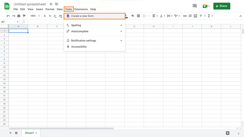 - On your spreadsheet, navigate to โToolsโ > โCreate a new form.โ