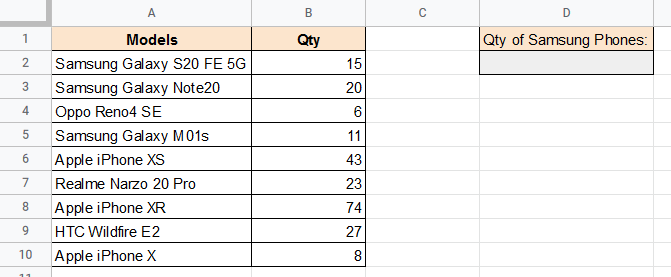 Once it completes going through all the models, the SUMIF function sums up the selected quantity values and displays the result in cell C2.