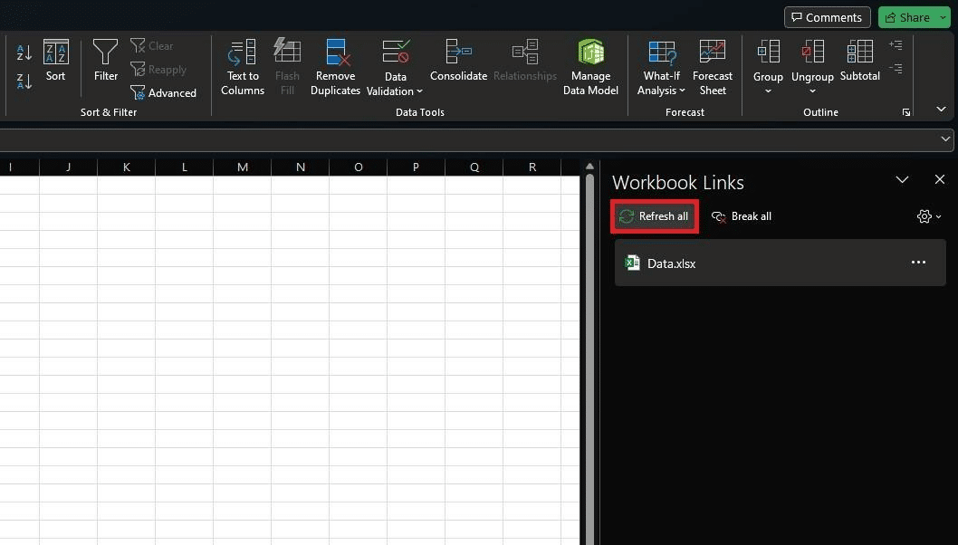 - A new โWorkbook Linksโ sidebar will open on the right side of the screen. Here, you can see the spreadsheets connected to the current workbook.