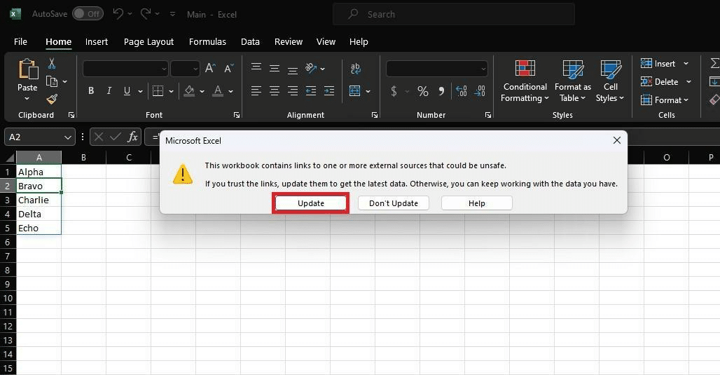 This is one of the quickest methods to break links in Excel. When the spreadsheet is opened, Excel will let you know that the workbook contains links, and you can choose to update the links if you trust the source file.