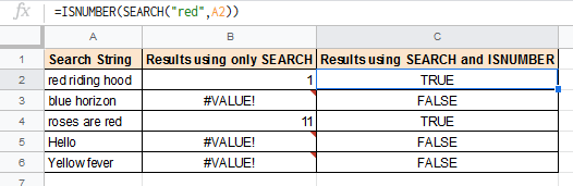 The image below demonstrates how the SEARCH function works. Here, I am just looking if each cell contains the word โredโ in it.