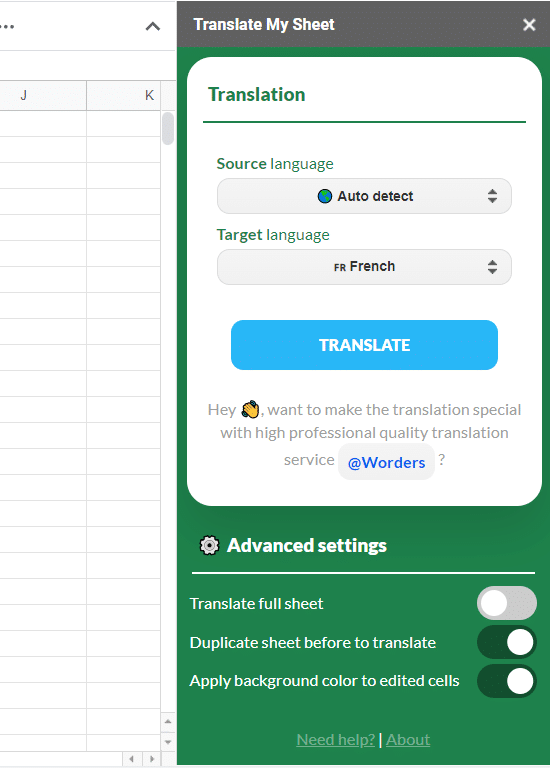 You can translate an individual cell or the whole sheet and you can even duplicate the sheet before you translate. If you choose to duplicate the sheet, your translated text will appear in a new Google Sheets window.