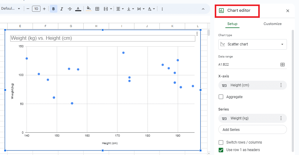 - Google usually tries to understand your selected data and displays the chart it thinks is the best representation for it. Ideally, it should show a Scatter Chart. However, if you see some other kind of chart, go to step 6.